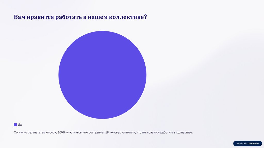 Согласно результатам опроса, 100% участников, что составляет 18 человек, ответили, что им нравится работать в коллективе.