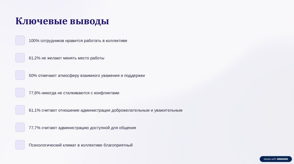 Ключевые выводы100% сотрудников нравится работать в коллективе