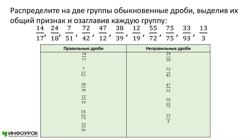 Распределите на две группы обыкновенные дроби, выделив ихобщий признак и озаглавив каждую группу: