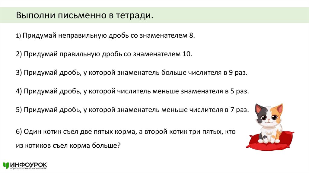 Выполни письменно в тетради.1) Придумай неправильную дробь со знаменателем 8.