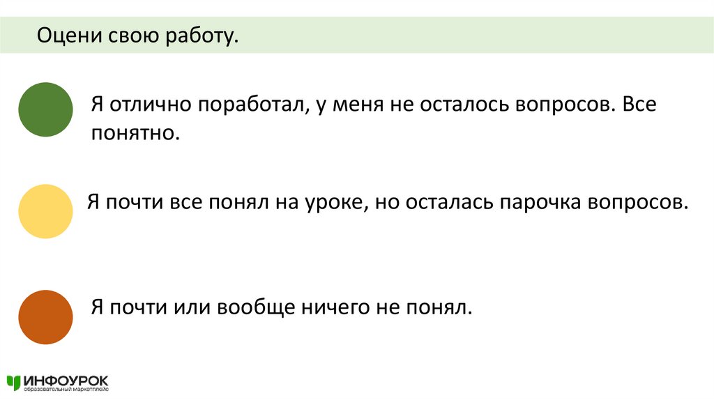 Оцени свою работу.Я отлично поработал, у меня не осталось вопросов. Все
