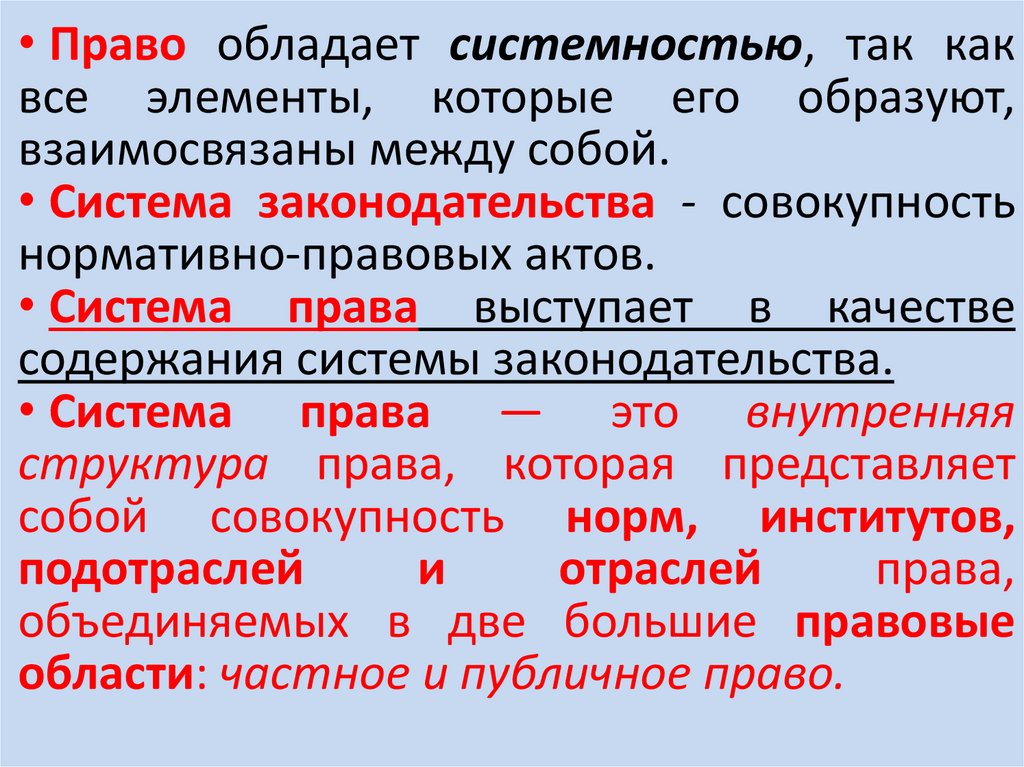 • Право обладает системностью, так каквсе элементы, которые его образуют,