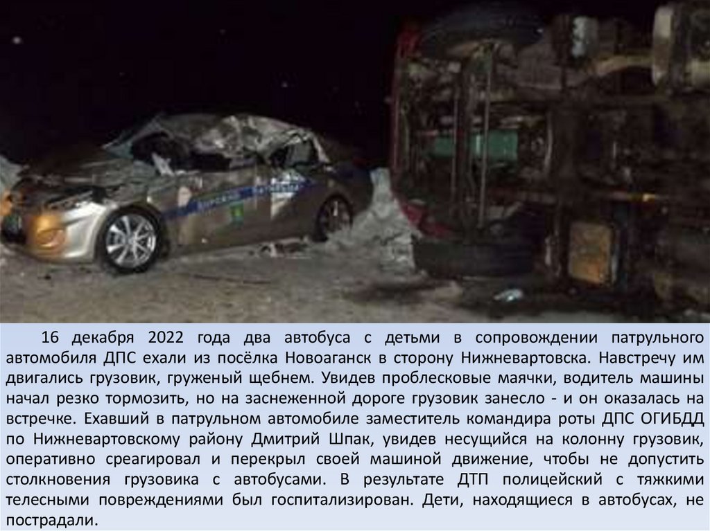 16 декабря 2022 года два автобуса с детьми в сопровождении патрульногоавтомобиля ДПС ехали из посёлка Новоаганск в сторону Нижневартовска. Навстречу им