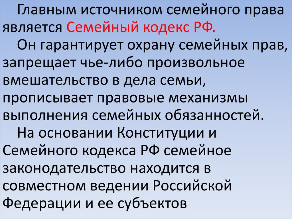 Главным источником семейного праваявляется Семейный кодекс РФ.
