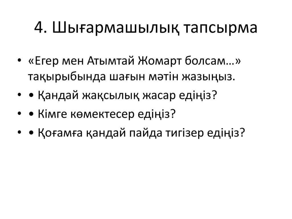 4. Шығармашылық тапсырма• «Егер мен Атымтай Жомарт болсам…»