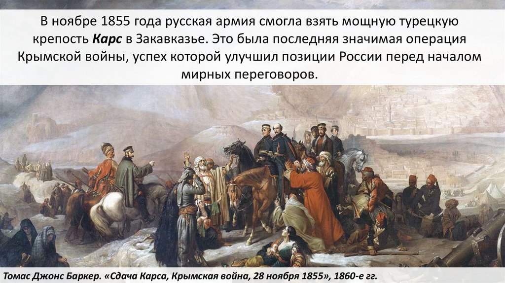 В ноябре 1855 года русская армия смогла взять мощную турецкуюкрепость Карс в Закавказье. Это была последняя значимая операция
