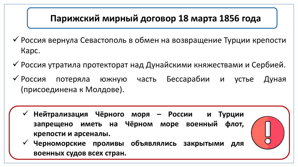 Парижский мирный договор 18 марта 1856 годаРоссия вернула Севастополь в обмен на возвращение Турции крепости