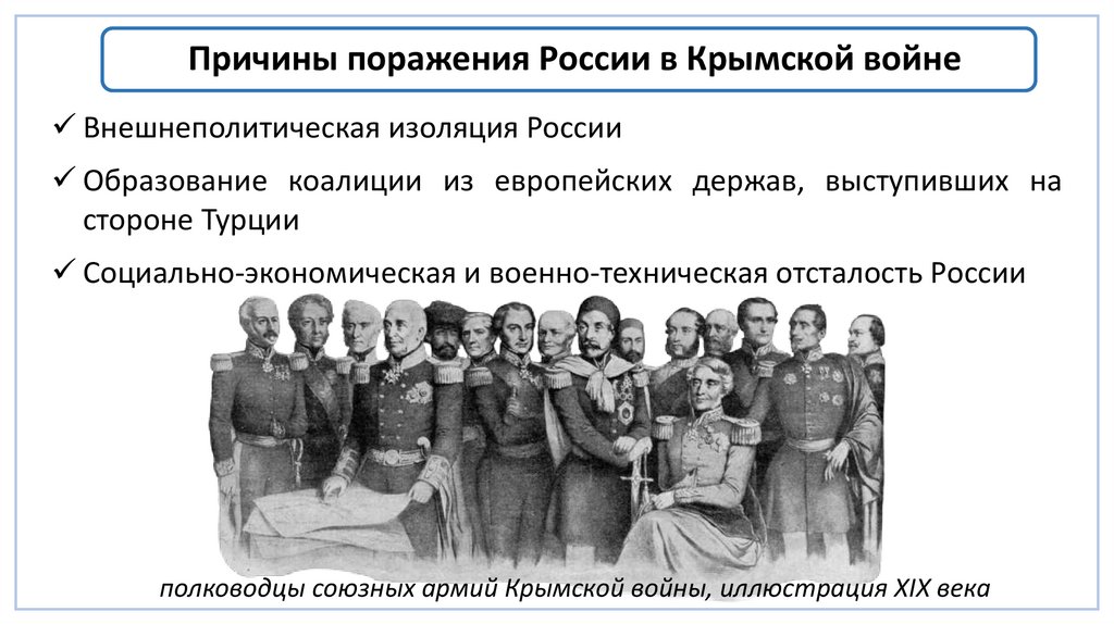 Причины поражения России в Крымской войнеВнешнеполитическая изоляция России