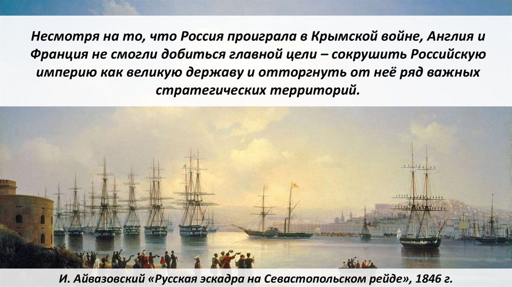 Несмотря на то, что Россия проиграла в Крымской войне, Англия иФранция не смогли добиться главной цели – сокрушить Российскую