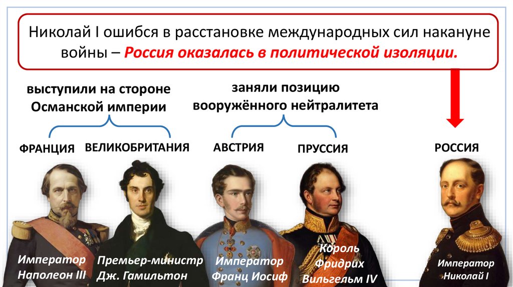 Николай I ошибся в расстановке международных сил накануневойны – Россия оказалась в политической изоляции.