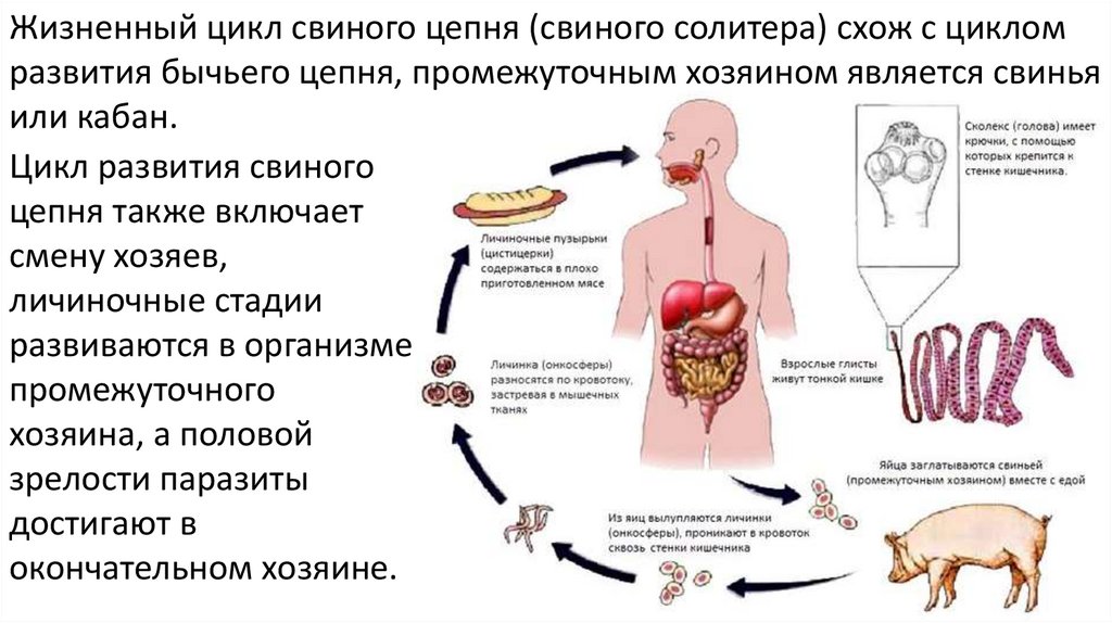 Жизненный цикл свиного цепня (свиного солитера) схож с цикломразвития бычьего цепня, промежуточным хозяином является свинья