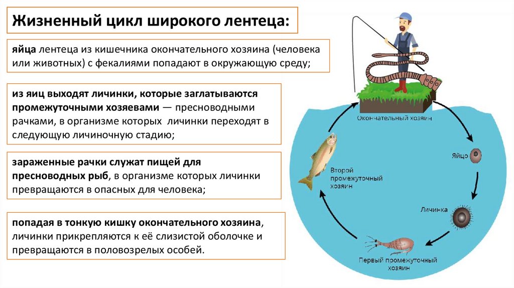 Жизненный цикл широкого лентеца:яйца лентеца из кишечника окончательного хозяина (человека