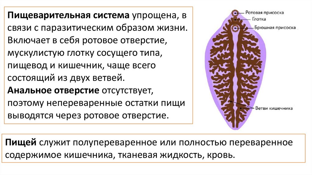 Пищеварительная система упрощена, всвязи с паразитическим образом жизни.
