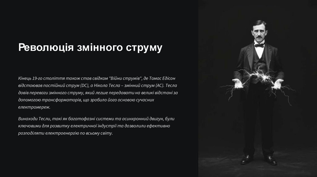 Революція змінного струмуКінець 19-го століття також став свідком "Війни струмів", де Томас Едісон