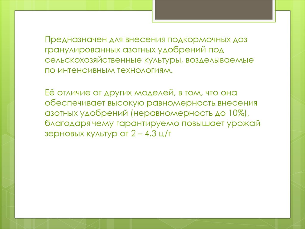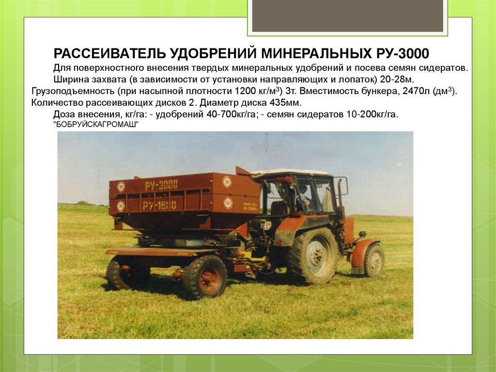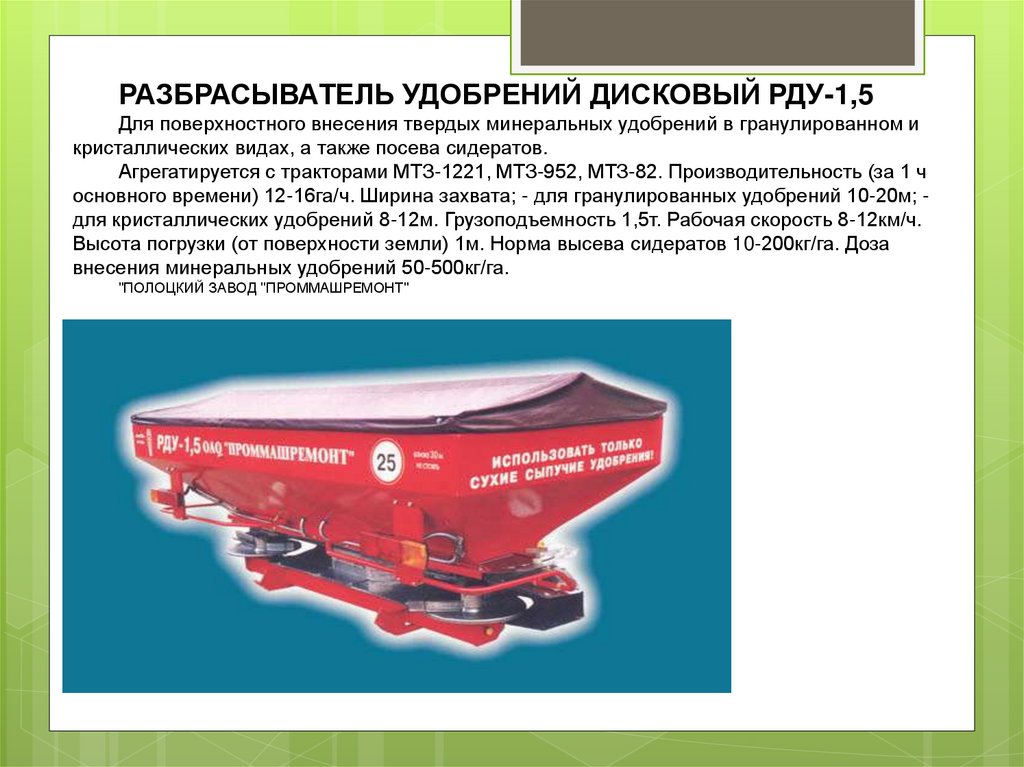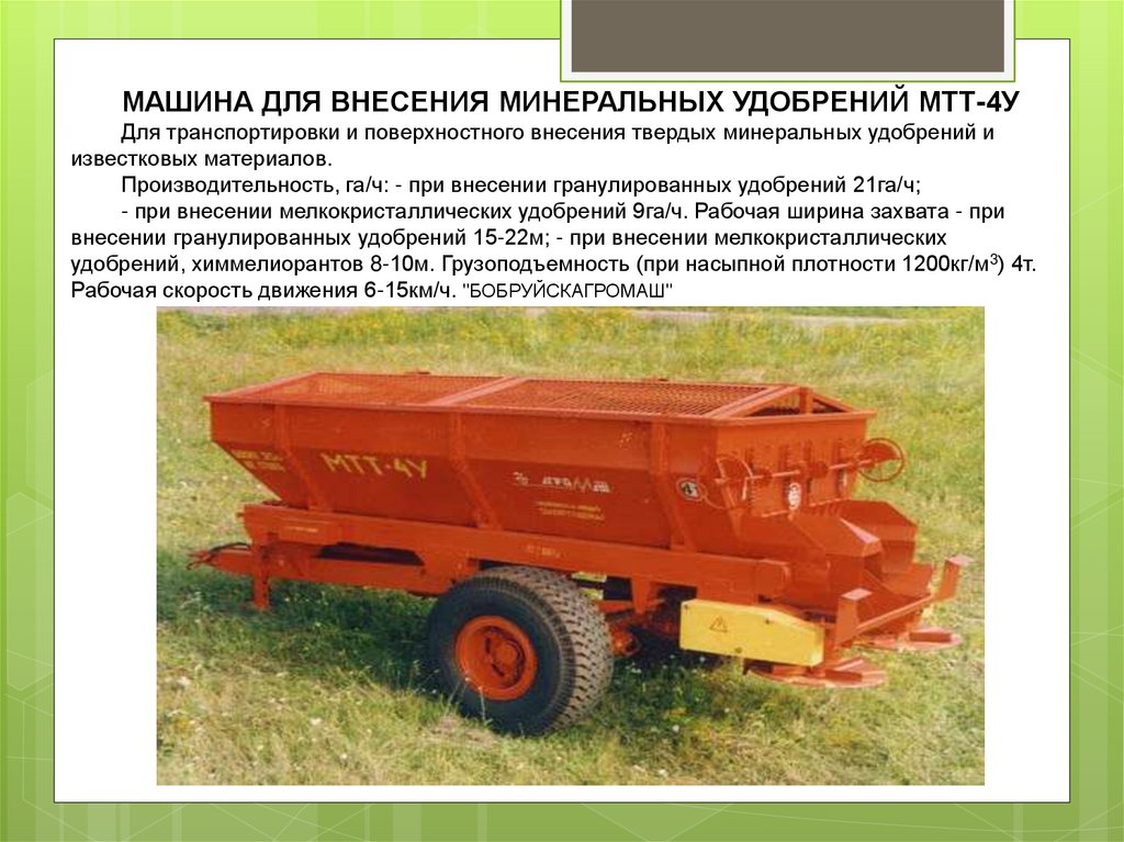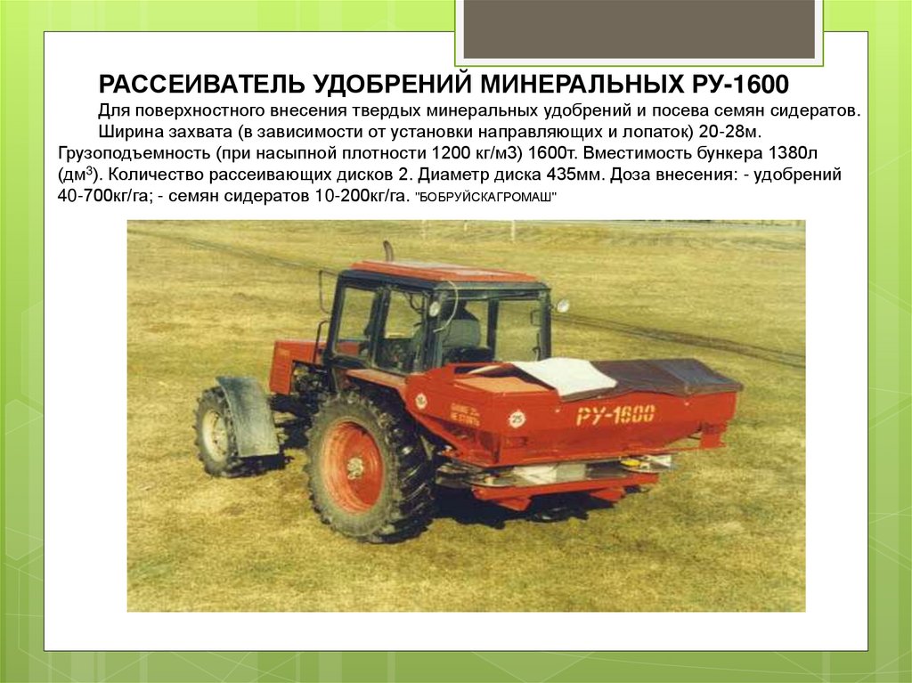32. Машина предназначена для транспортирования и высокоточного поверхностного внесения простых и смешанных минеральных удобрений