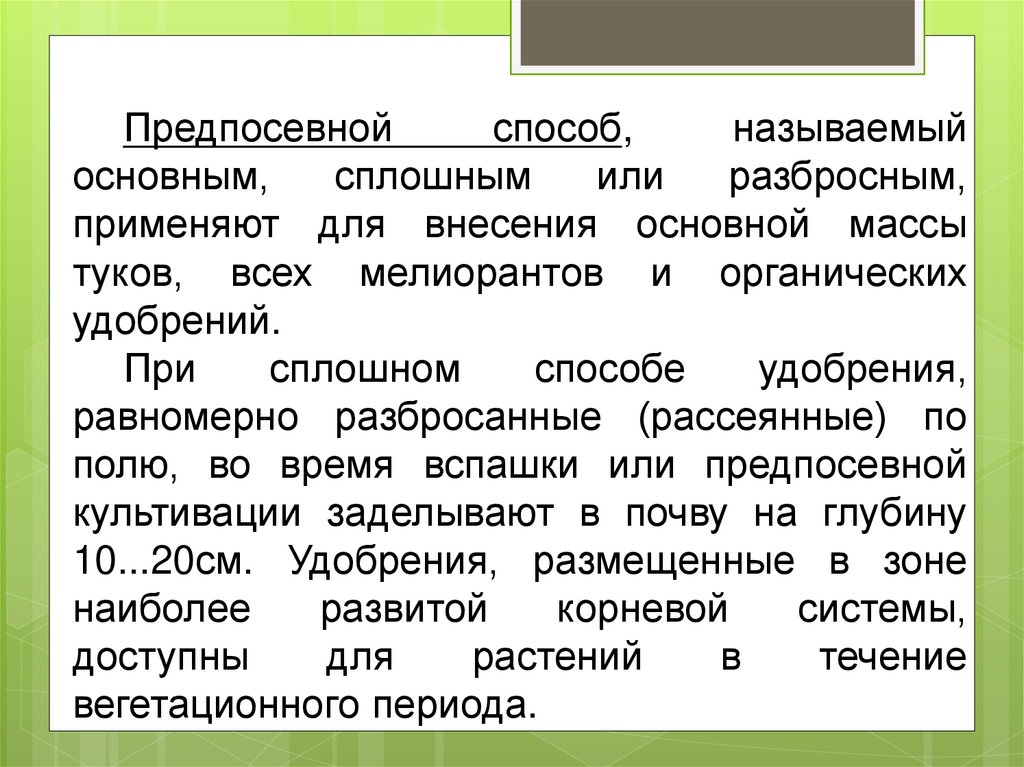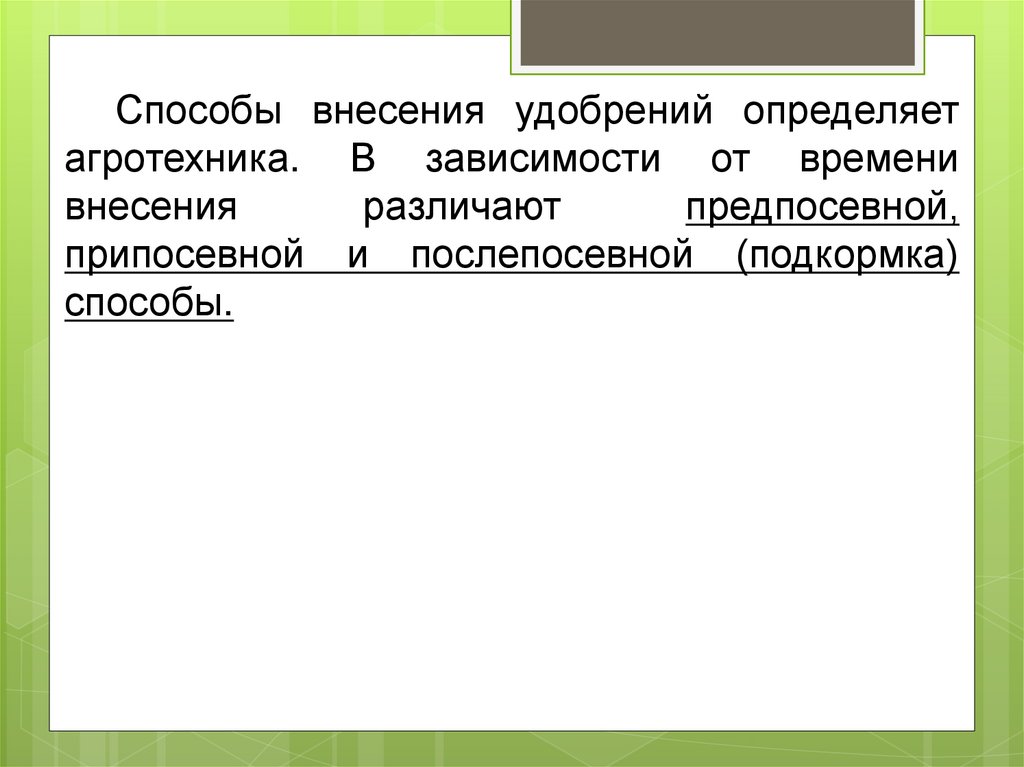 Способы внесения удобрений определяетагротехника. В зависимости от времени