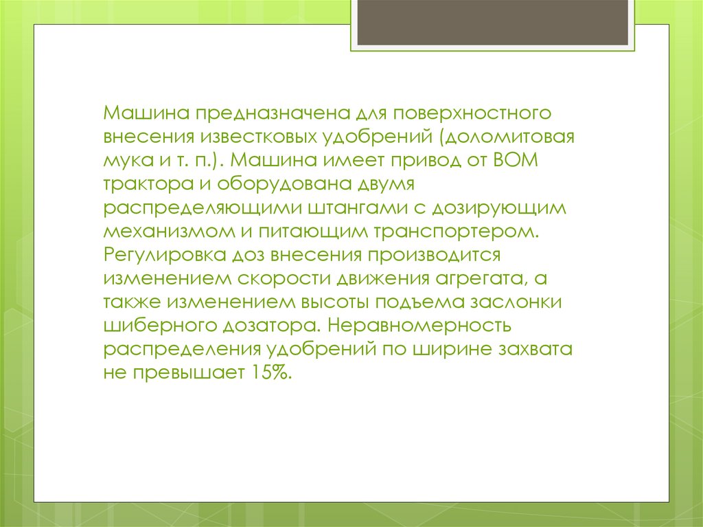 Машина предназначена для поверхностноговнесения известковых удобрений (доломитовая