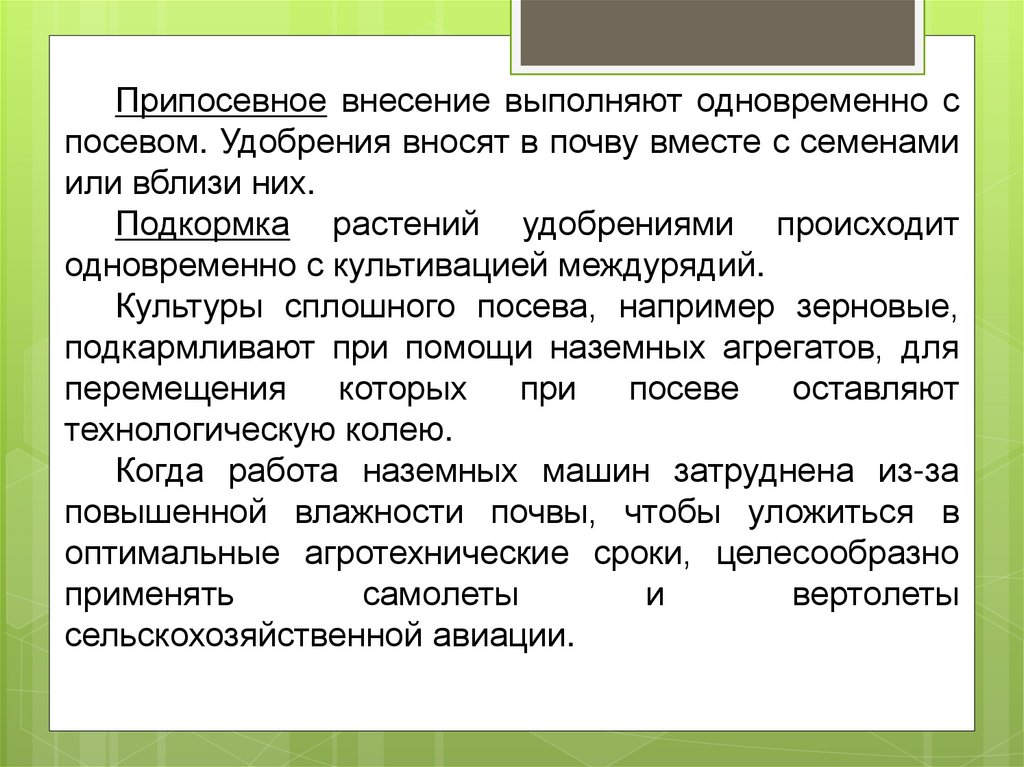 Припосевное внесение выполняют одновременно спосевом. Удобрения вносят в почву вместе с семенами