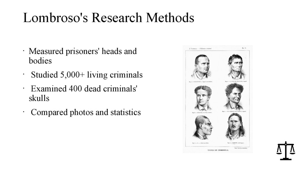 Lombroso's Research MethodsMeasured prisoners' heads and