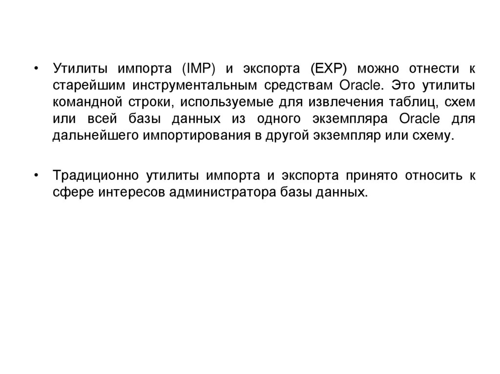 • Утилиты импорта (IMP) и экспорта (ЕХР) можно отнести кстарейшим инструментальным средствам Oracle. Это утилиты