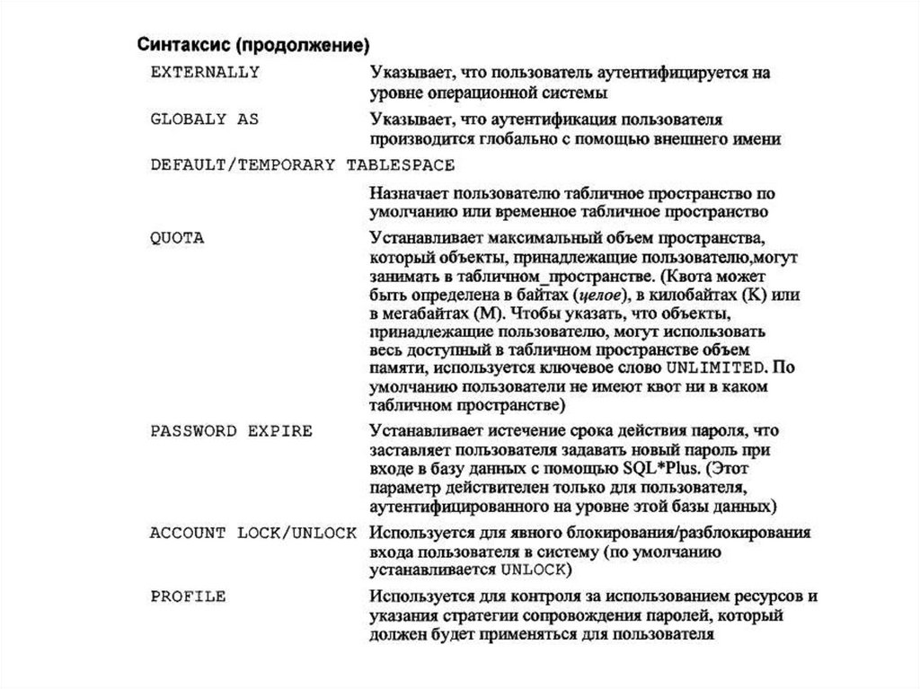 SQL> CREATE USER Новый_Пользователь IDENTIFIEDBY Пароль;