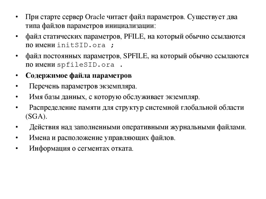 • При старте сервер Oracle читает файл параметров. Существует дватипа файлов параметров инициализации:
