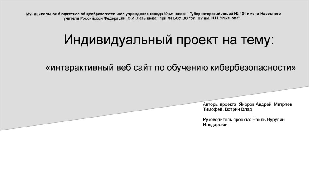 Муниципальное бюджетное общеобразовательное учреждение города Ульяновска "Губернаторский лицей № 101 имени Народногоучителя Российской Федерации Ю.И. Латышева" при ФГБОУ ВО "УлГПУ им. И.Н. Ульянова".