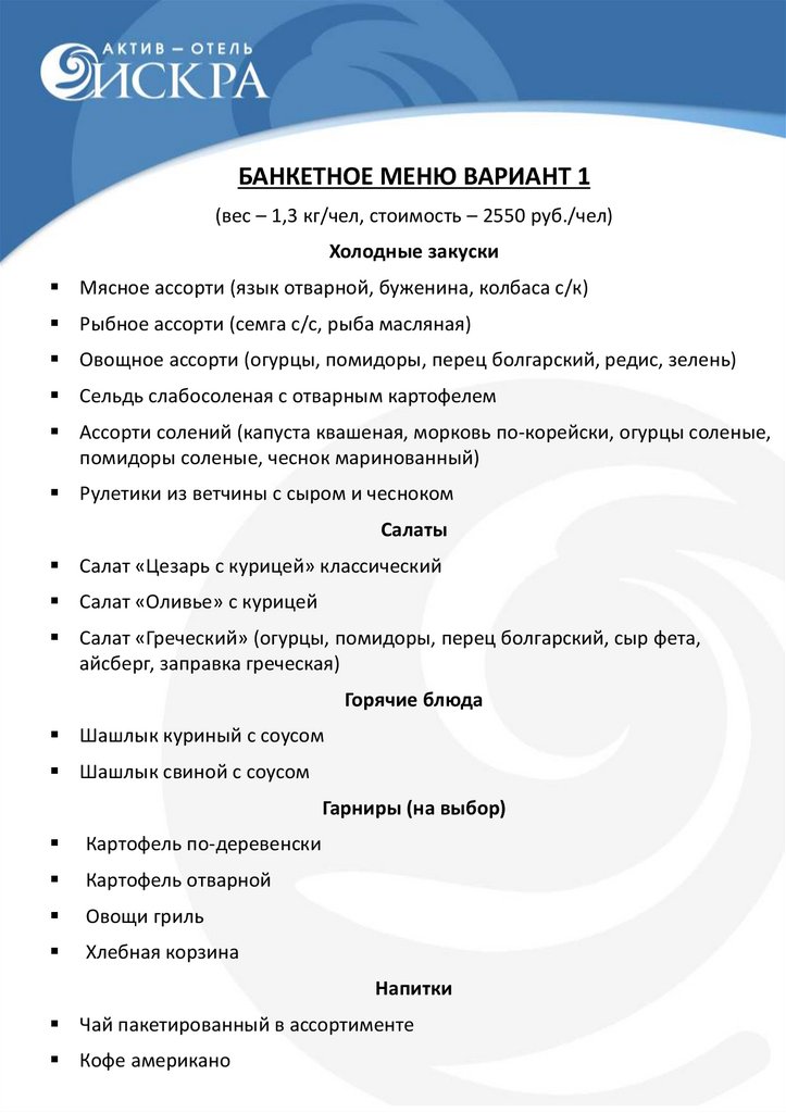 БАНКЕТНОЕ МЕНЮ ВАРИАНТ 1(вес – 1,3 кг/чел, стоимость – 2550 руб./чел)