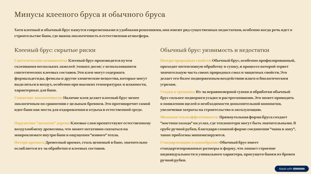 Минусы клееного бруса и обычного брусаХотя клееный и обычный брус кажутся современными и удобными решениями, они имеют ряд существенных недостатков, особенно когда речь идет о
