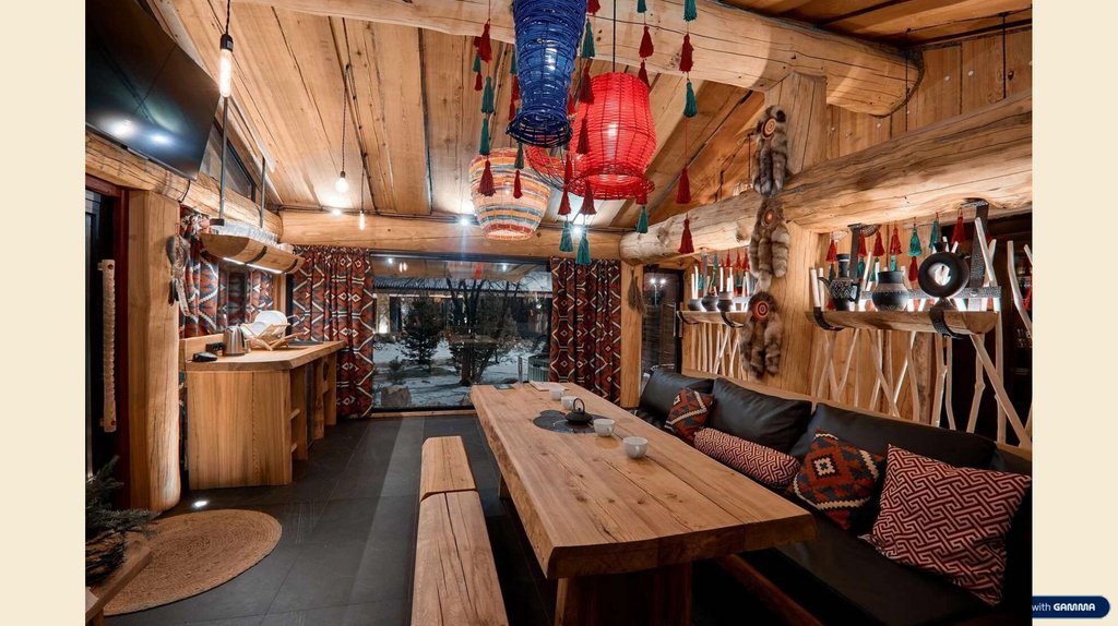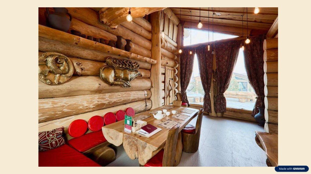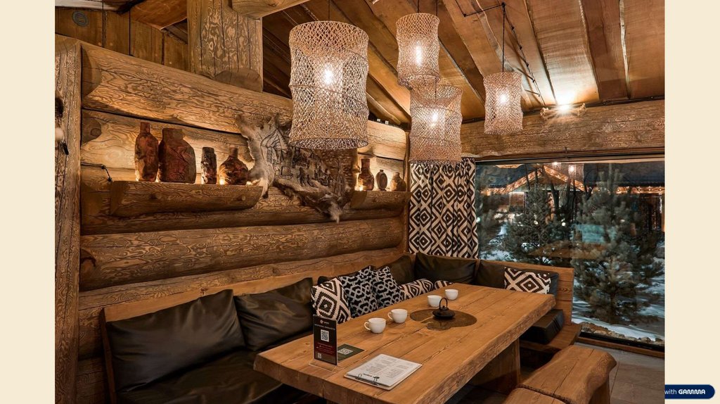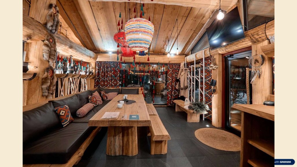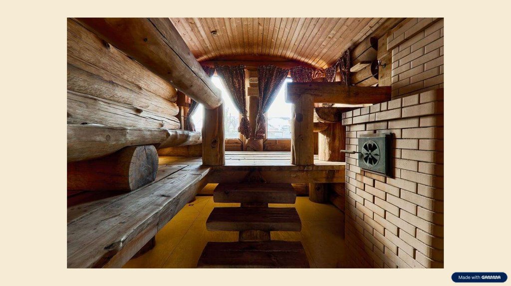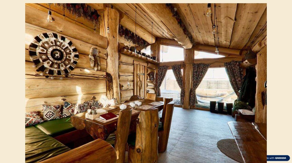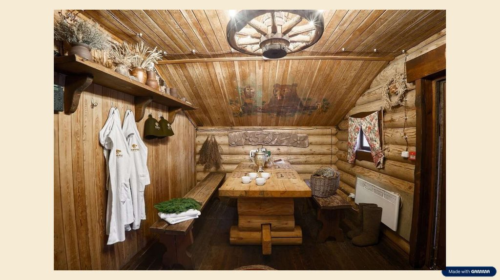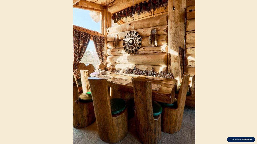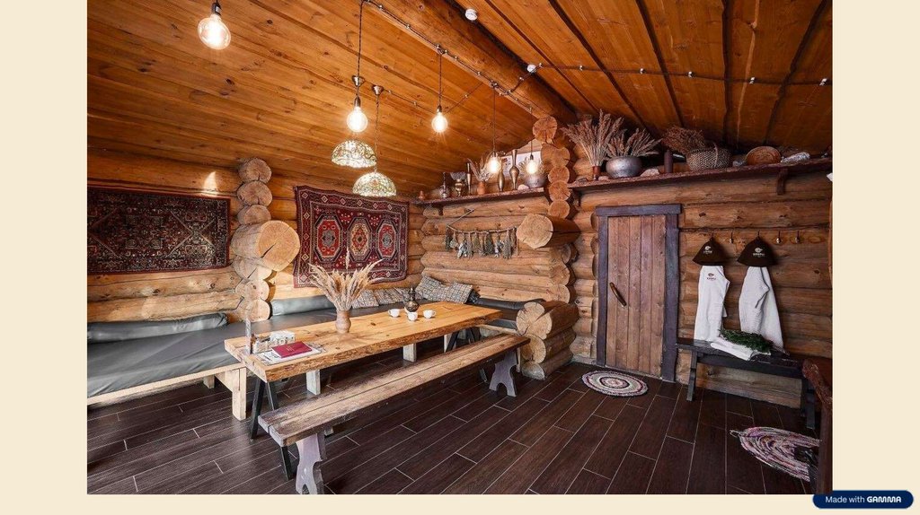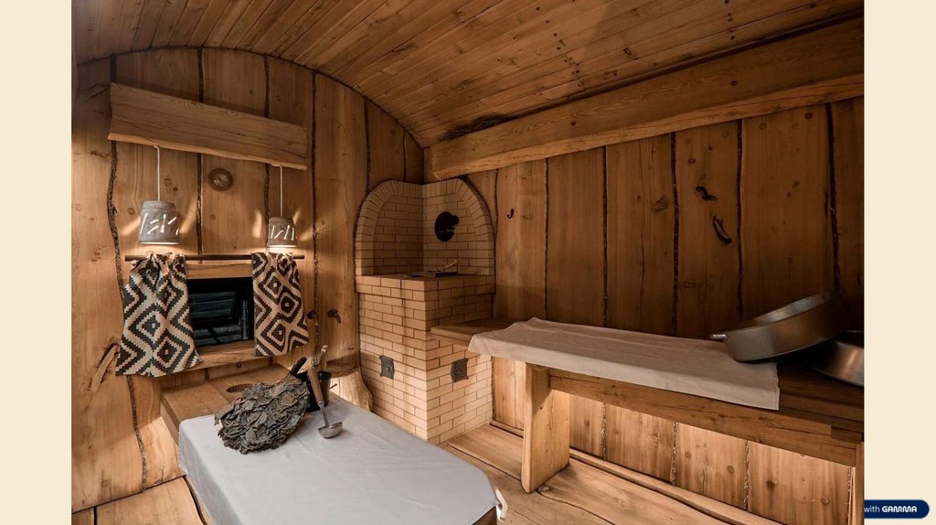 Элементы: В интерьере скифской бани преобладают массивные каменные и деревянные элементы. Камень используется для основания,