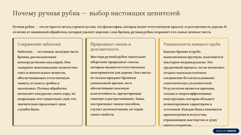 отличие от машинной обработки, которая удаляет верхние слои бревна, ручная рубка сохраняет его самые ценные части.