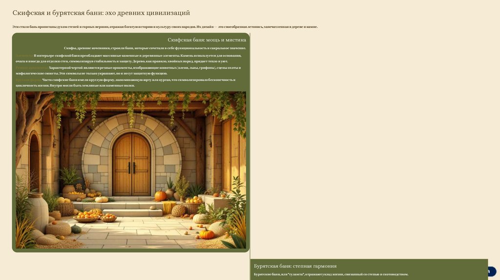 Скифская и бурятская бани: эхо древних цивилизацийЭти стили бань пропитаны духом степей и горных вершин, отражая богатую историю и культуру своих народов. Их дизайн — это своеобразная летопись, запечатленная в дереве и камне.