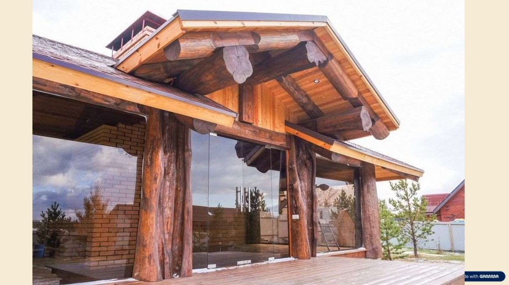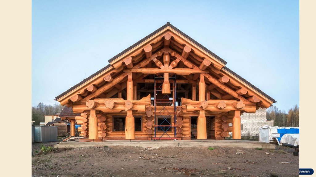 очага и иногда для отделки стен, символизируя стабильность и защиту. Дерево, как правило, хвойных пород, придает тепло и уют.