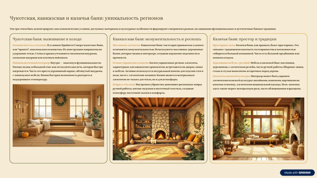 Чукотская, кавказская и казачья бани: уникальность регионовЭти три стиля бань демонстрируют, как климатические условия, доступные материалы и культурные особенности формируют совершенно разные, но одинаково функциональные и аутентичные банные традиции.