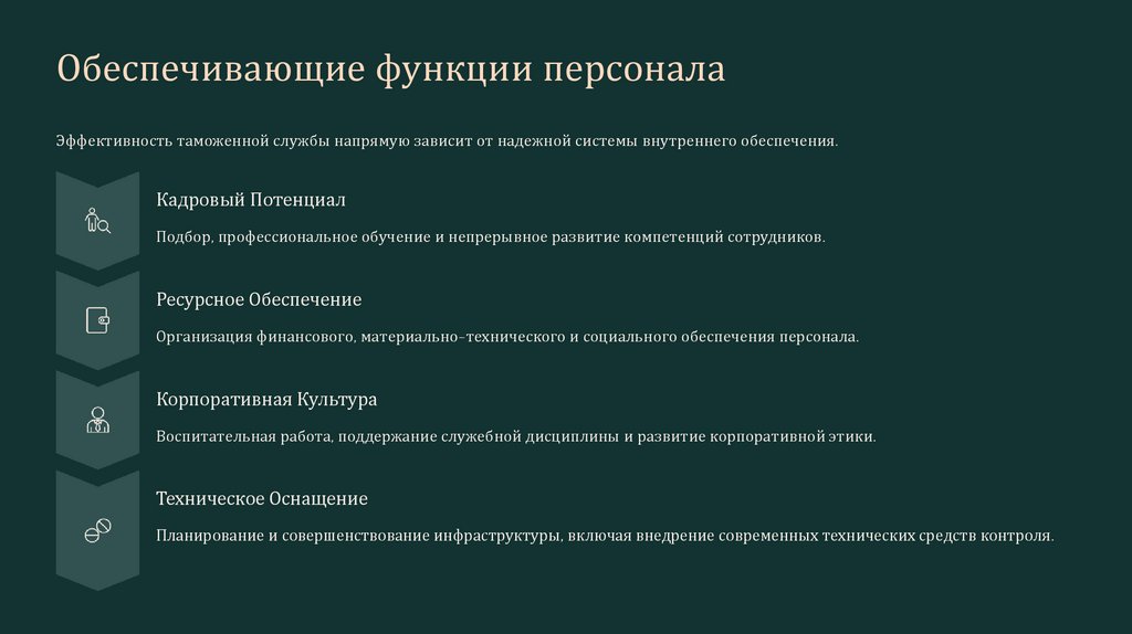 Обеспечивающие функции персоналаЭффективность таможенной службы напрямую зависит от надежной системы внутреннего обеспечения.