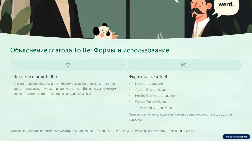 Метод: Объяснение с примерами. Материалы: Презентация с яркими картинками (показываем "I am a boy", "She is a girl" и т.д.).