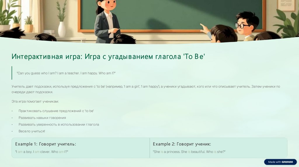 Учитель дает подсказки, используя предложения с 'to be' (например, 'I am a girl', 'I am happy'), а ученики угадывают, кого или что описывает учитель. Затем ученики по