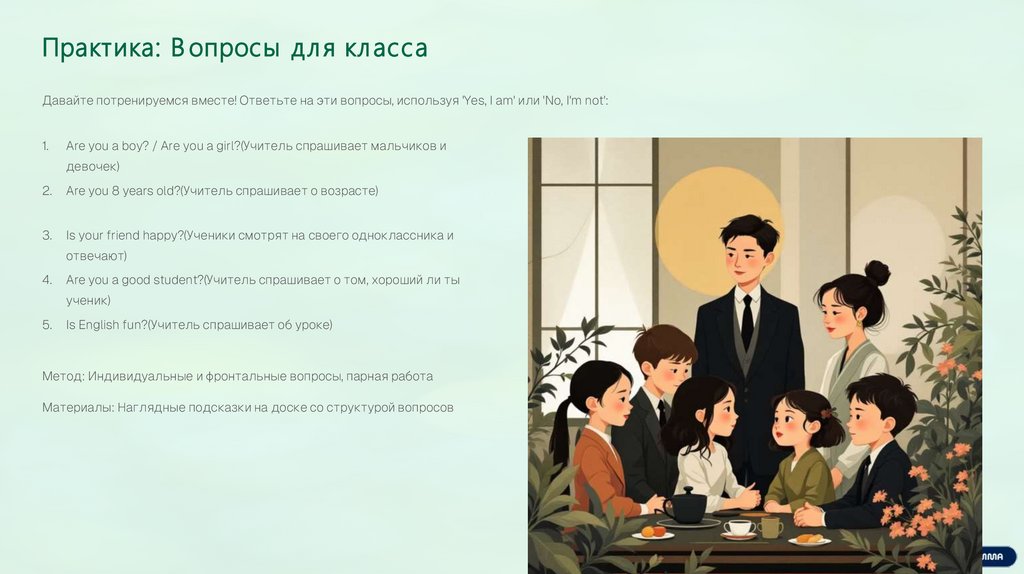 Практика: В опросы дл я кл асс аДавайте потренируемся вместе! Ответьте на эти вопросы, используя 'Yes, I am' или 'No, I'm not':