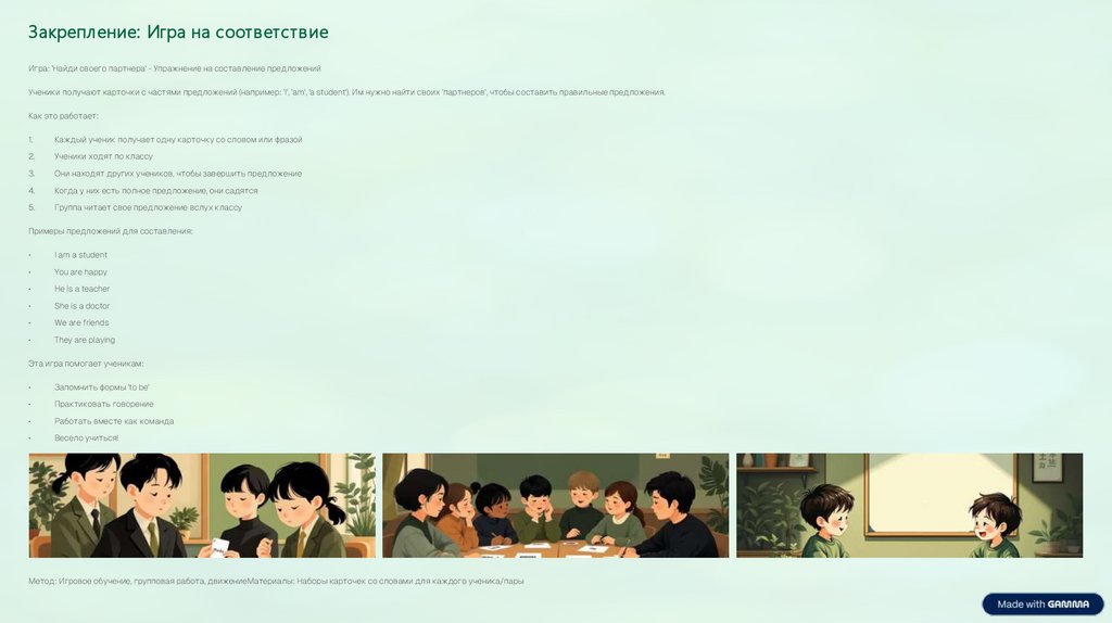 Ученики получают карточки с частями предложений (например: 'I', 'am', 'a student'). Им нужно найти своих 'партнеров', чтобы составить правильные предложения.