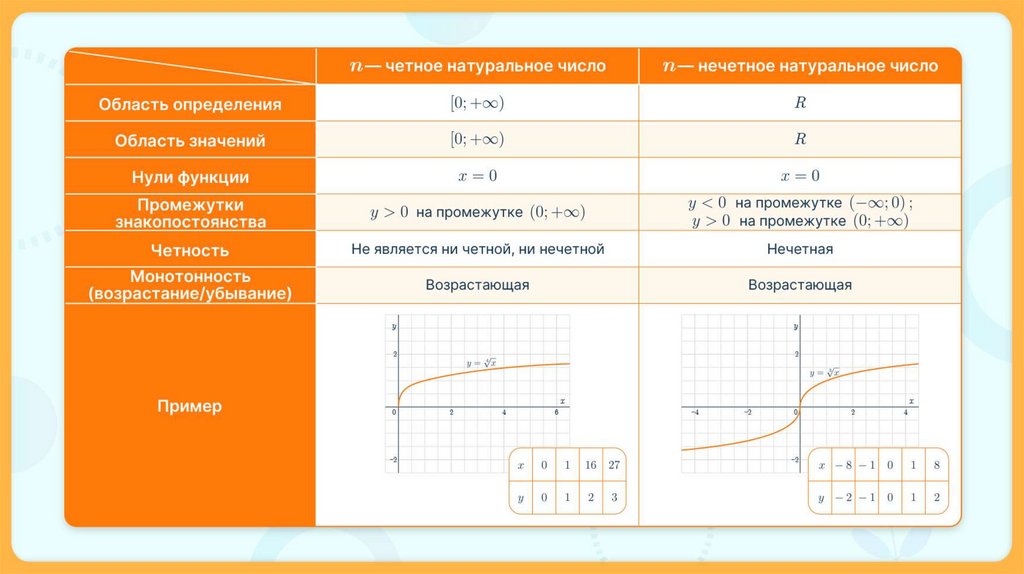 Свойства и график корня n-ой степени как функции обратной степени с натуральным показателем
