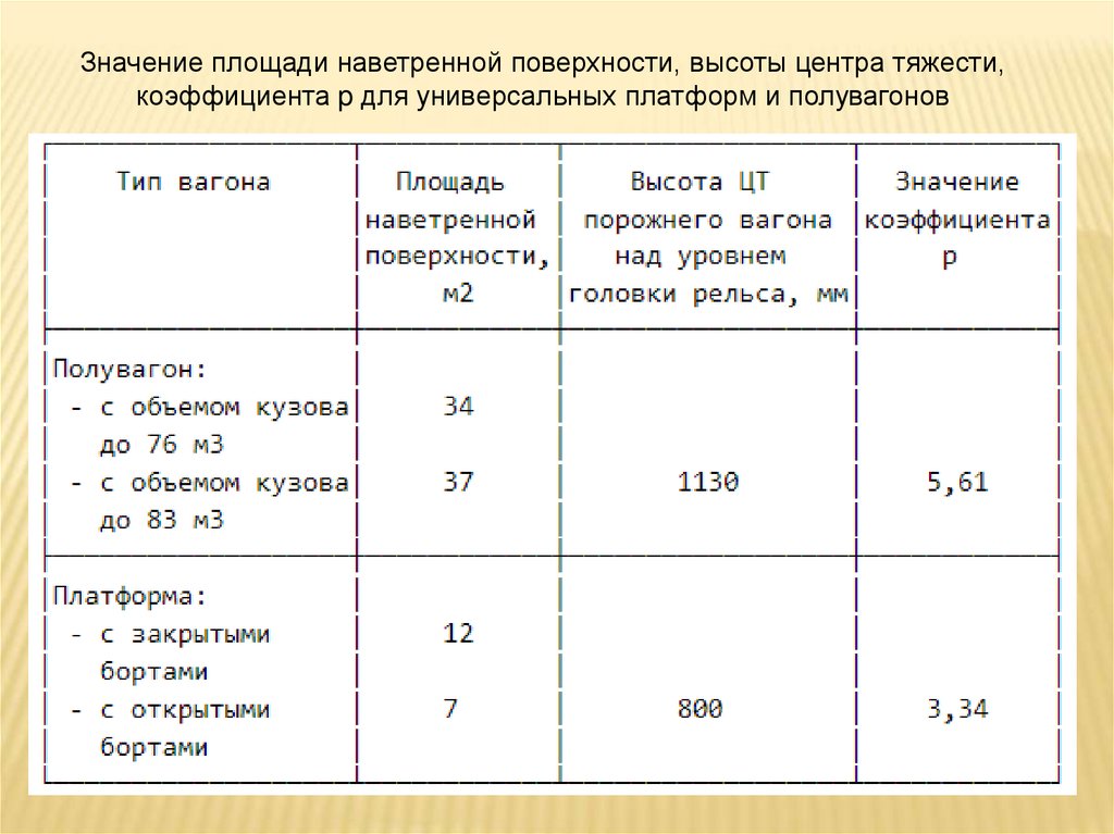 Значение площади наветренной поверхности, высоты центра тяжести,коэффициента p для универсальных платформ и полувагонов