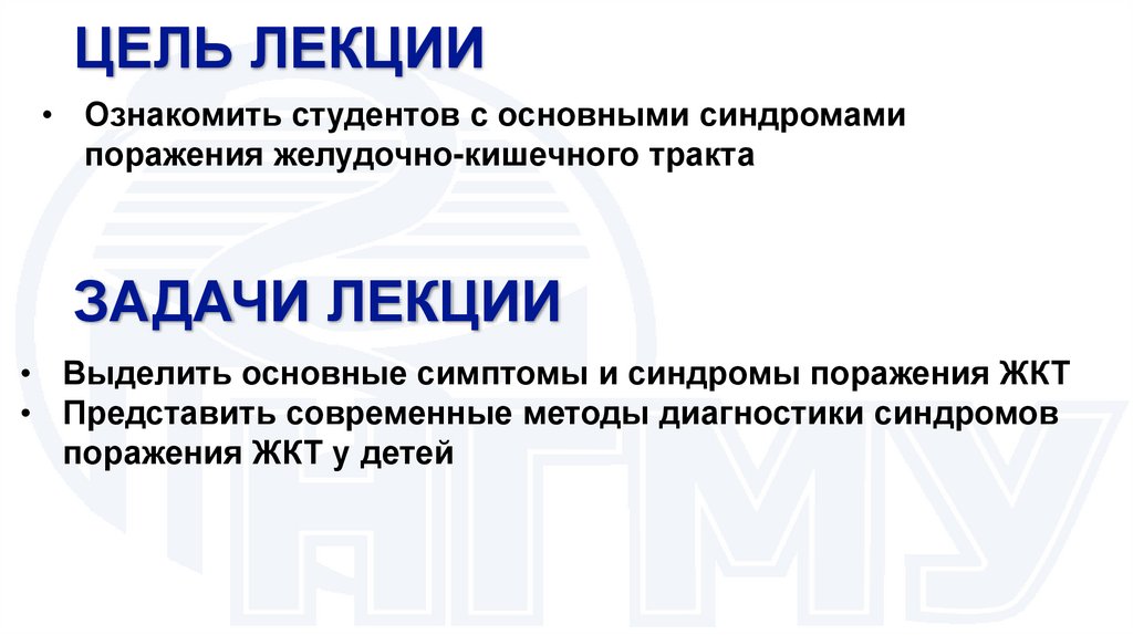 • Ознакомление студентов с симптомами исиндромами поражения желудочно-кишечного