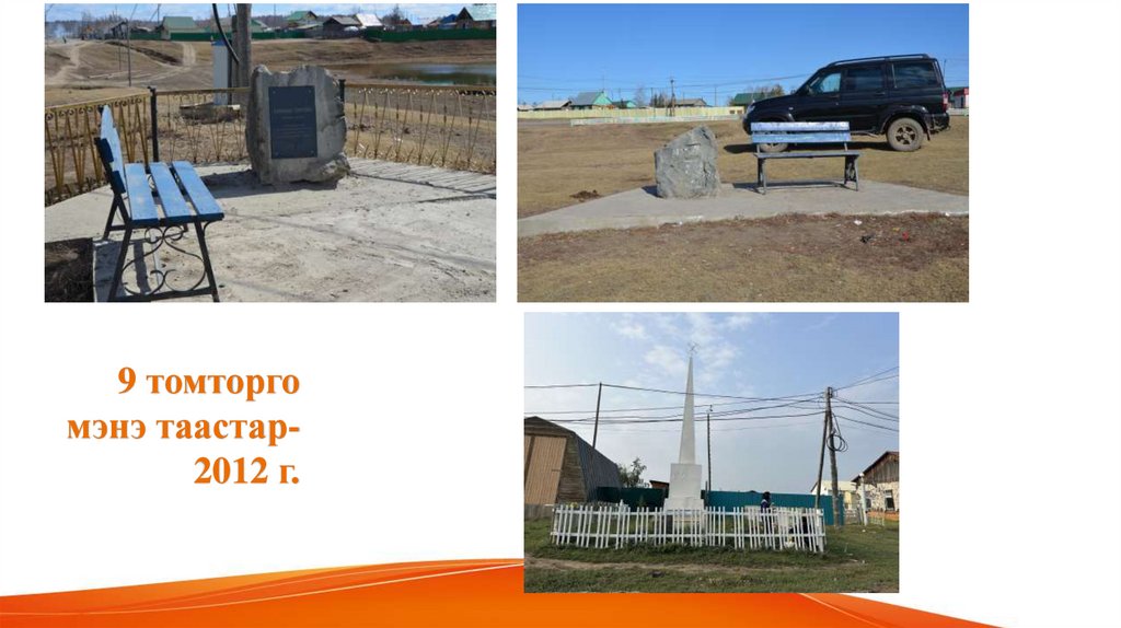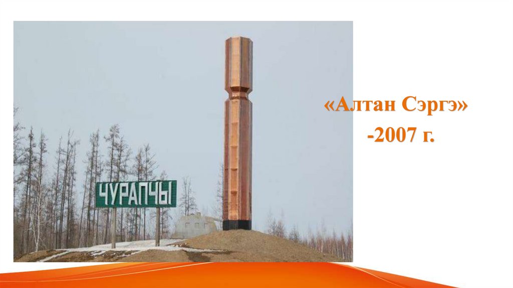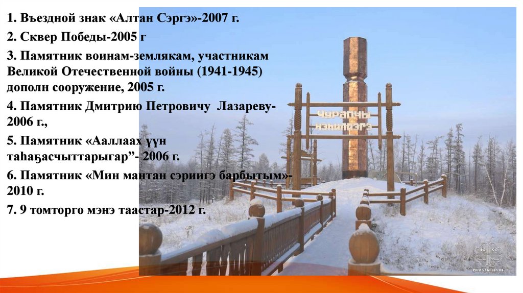 1. Въездной знак «Алтан Сэргэ»-2007 г.2. Сквер Победы-2005 г