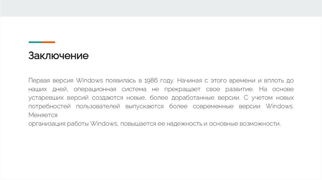 ЗаключениеПервая версия Windows появилась в 1986 году. Начиная с этого времени и вплоть до