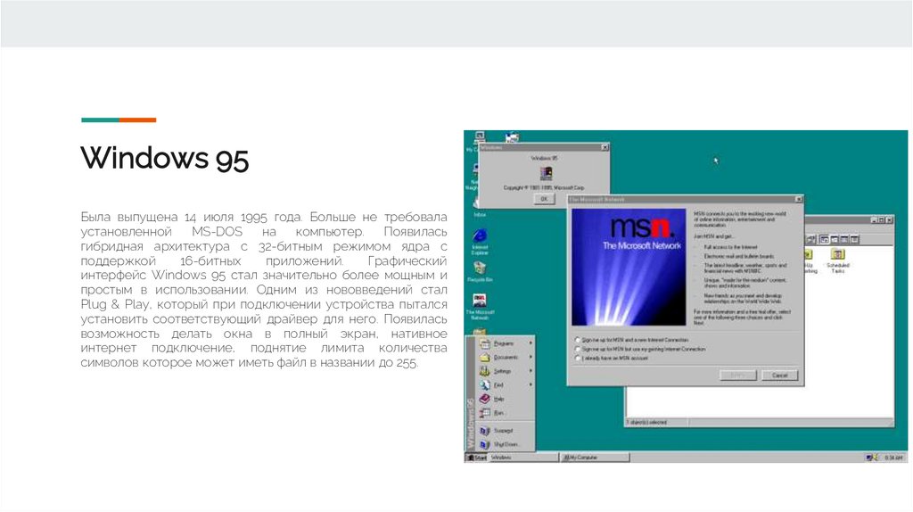 Windows 95Была выпущена 14 июля 1995 года. Больше не требовала