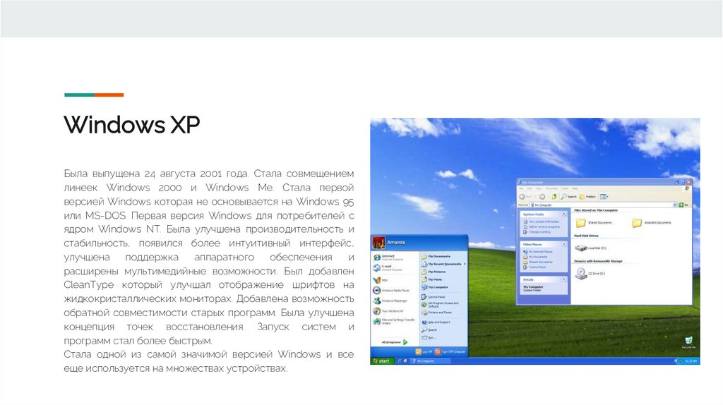 Windows XPБыла выпущена 24 августа 2001 года. Стала совмещением