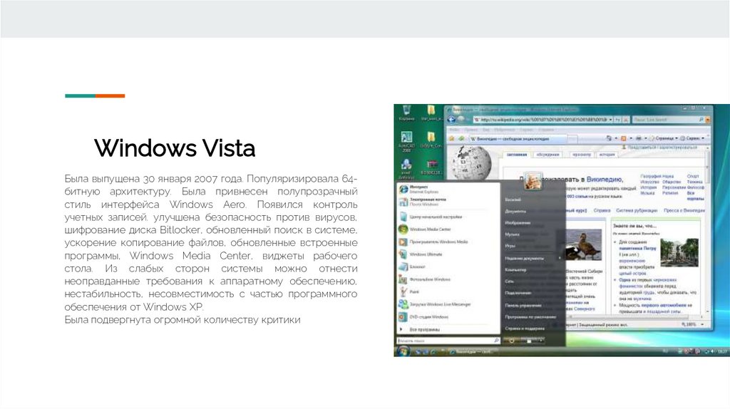 Windows VistaБыла выпущена 30 января 2007 года. Популяризировала 64битную архитектуру. Была привнесен полупрозрачный