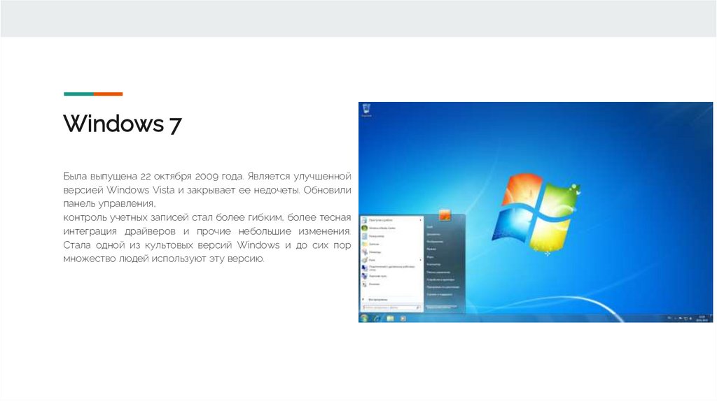 Windows 7Была выпущена 22 октября 2009 года. Является улучшенной