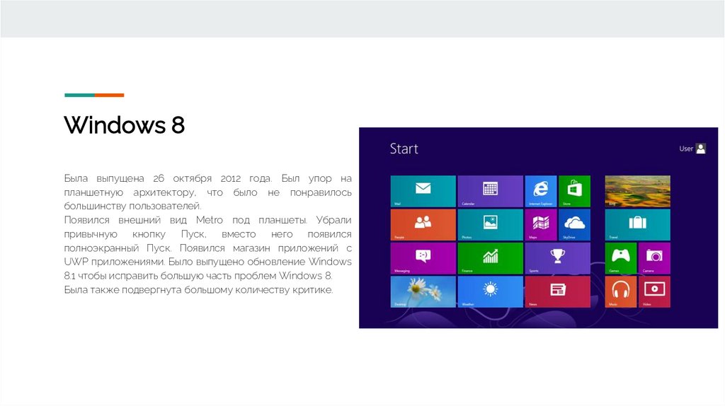 Windows 8Была выпущена 26 октября 2012 года. Был упор на