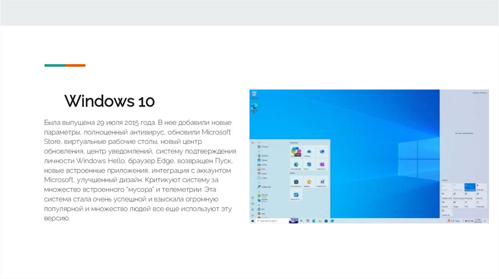 Windows 10Была выпущена 29 июля 2015 года. В нее добавили новые